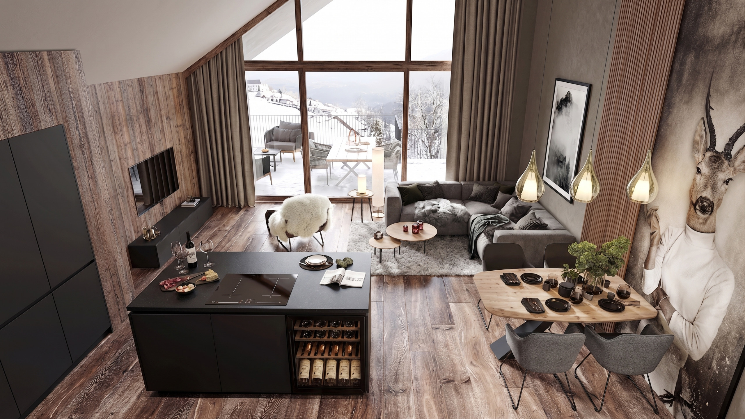 The fully equipped kitchen invites you to cook and enjoy meals together. Cutlery and cooking utensils are provided. The kitchen is equipped with a stove, oven, microwave, refrigerator with freezer compartment, and dishwasher, as well as a toaster, electric kettle, and coffee machine. A small ALPS RESORTS starter set with a dishwasher tablet, dishwashing liquid (20 ml), sponge, trash bag, cleaning cloth, and dish towel is provided upon arrival.