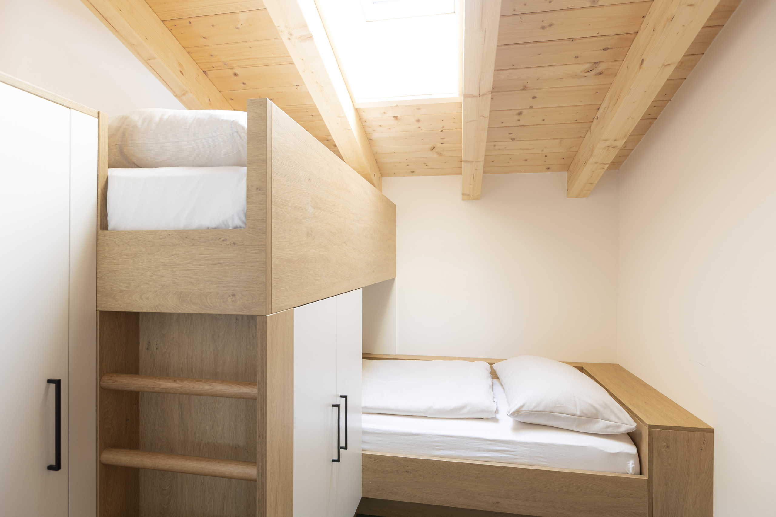 On 112 m², our apartment provides space for up to 8 persons. Your holiday apartment features three bedrooms (two with one double and one single bed each, and a third with a bunk bed), two bathrooms with shower and toilet (hairdryer available), a living-dining area with kitchenette, and a 35 m² balcony.