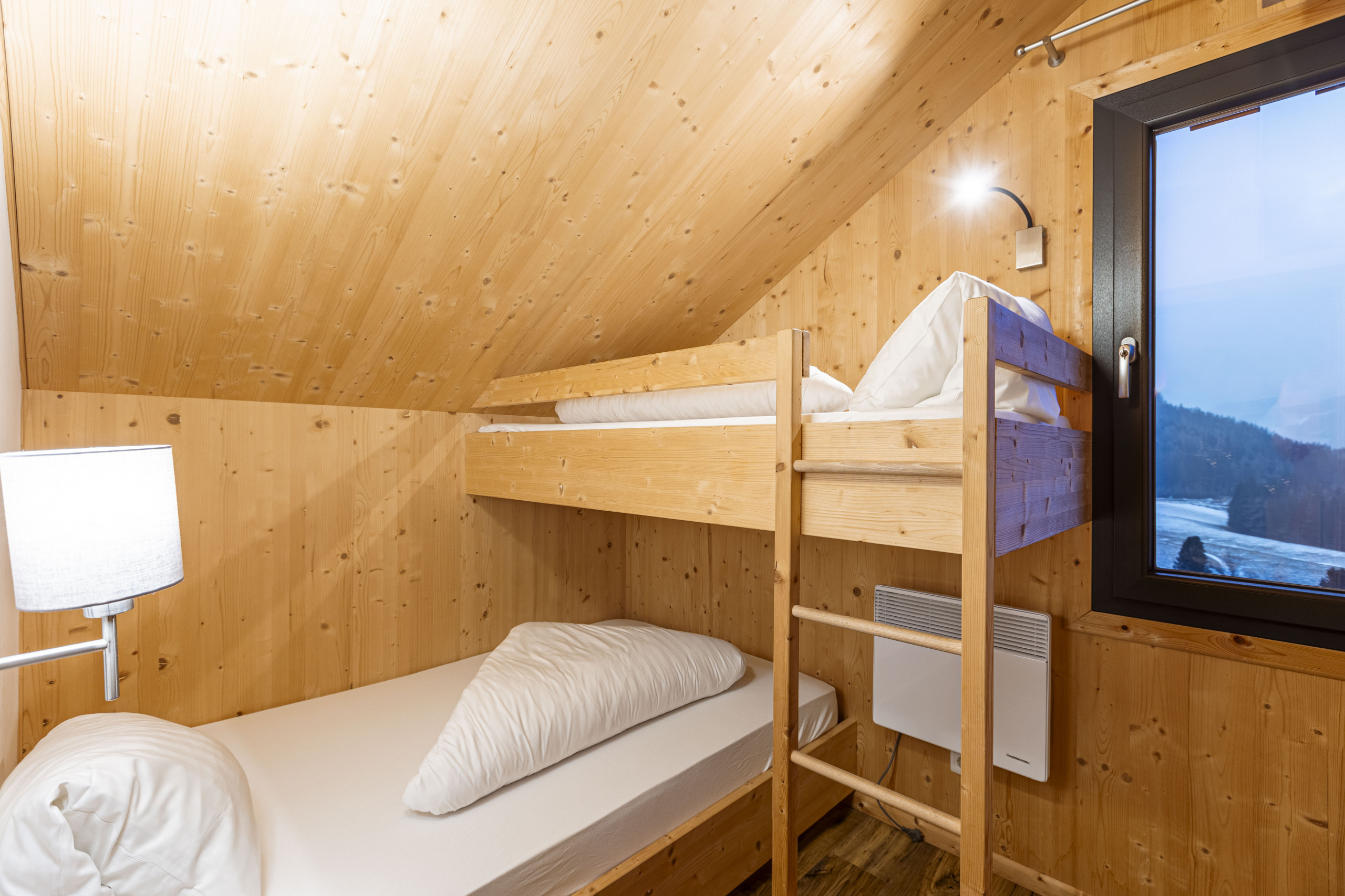 On 83 m², our Superior Chalet # 63 with IR-Sauna & whirlpool bath provides ample space for up to 6 people. Your holiday home features 3 bedrooms, 1 bathroom with indoor-whirlpool and infrared sauna (hairdryer available) and a furnished terrace. You will be sleeping on comfortable double beds. 1 of the rooms features a bunk bed.