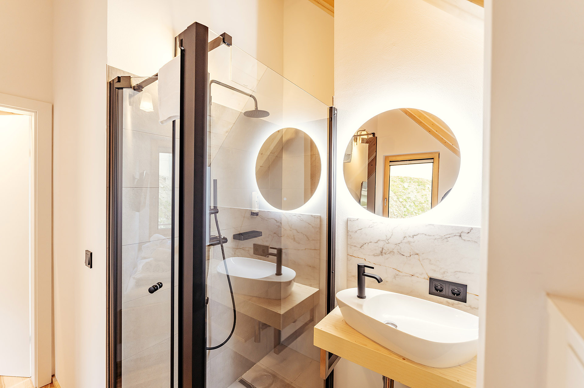 The two-story chalet offers enough space for up to 6 people on a living area of 67 m². It has 2 bedrooms with double beds. One bedroom is equipped with a additionally bathtub. In the living area there are 2 more sleeping places available. For maximum comfort, the chalet also offers 2 bathrooms with showers and a separate toilet.
