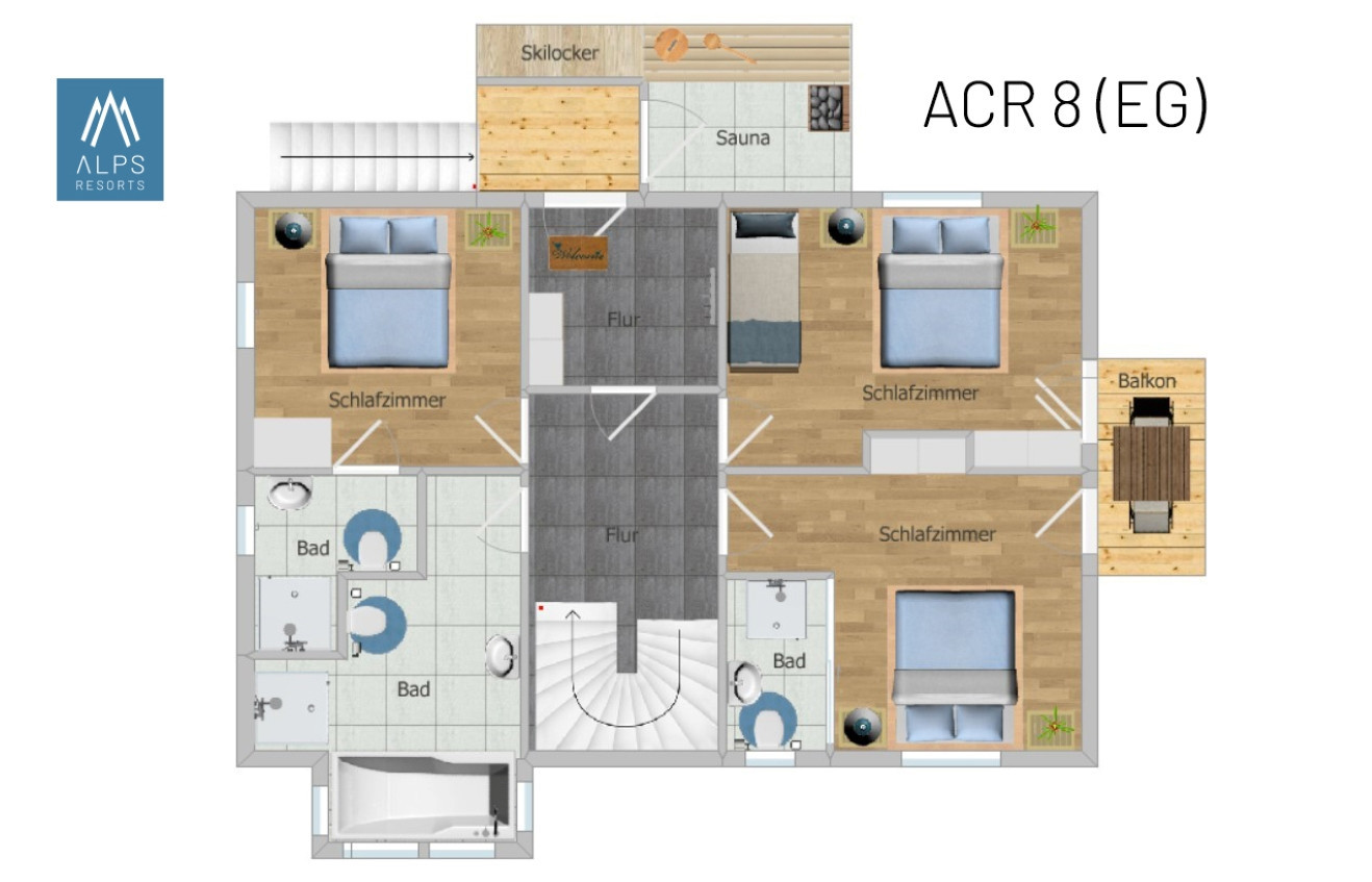 With 120 m², the modern Superior Chalet offers space for up to 10 people. The wellness chalet has 4 bedrooms with double beds, 3 bathrooms with shower and 1 bathroom with bathtub. Amenities also include a Finnish panoramic sauna with a top view of the Enns Valley. You can also enjoy exactly this view from the two balconies. One of the bedrooms additionally has 1 bunk bed.