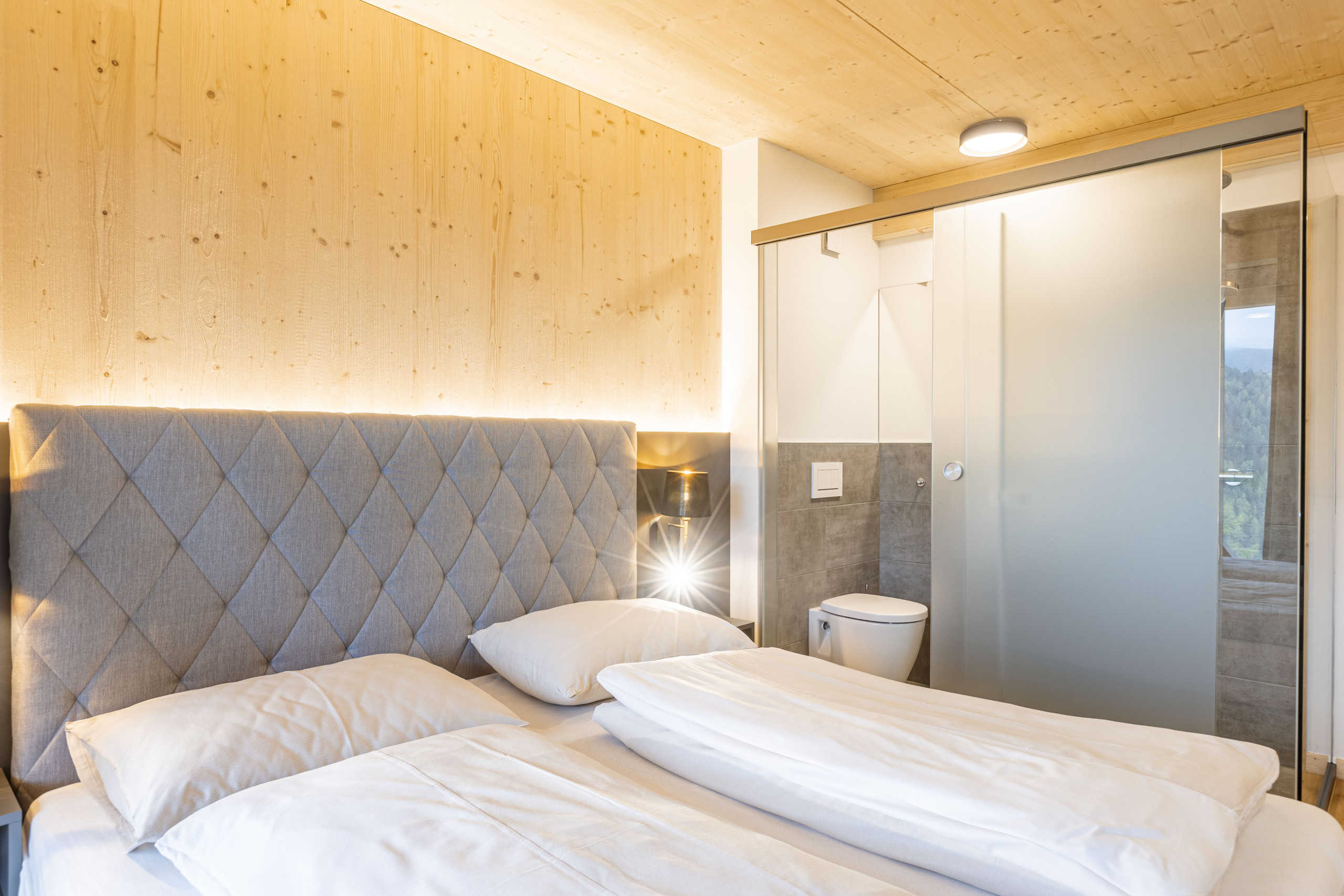 Experience pure relaxation in your private Finnish sauna or in the hot tub without whirlpool function on the terrace, while enjoying the breathtaking view of the surrounding mountain landscape. Some bedrooms even open onto balconies that look directly into the stone pine forest – a place where you can let your soul dangle.