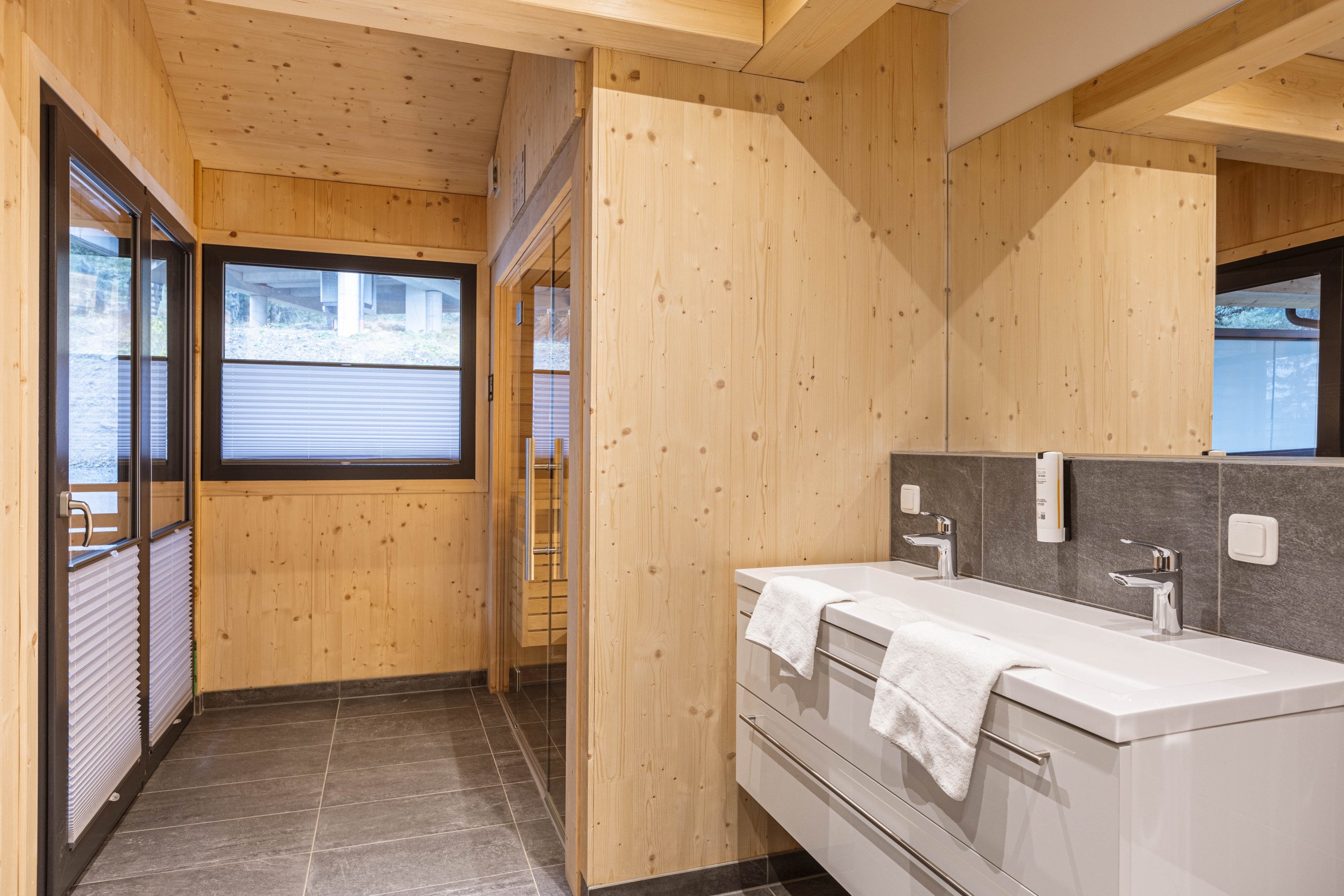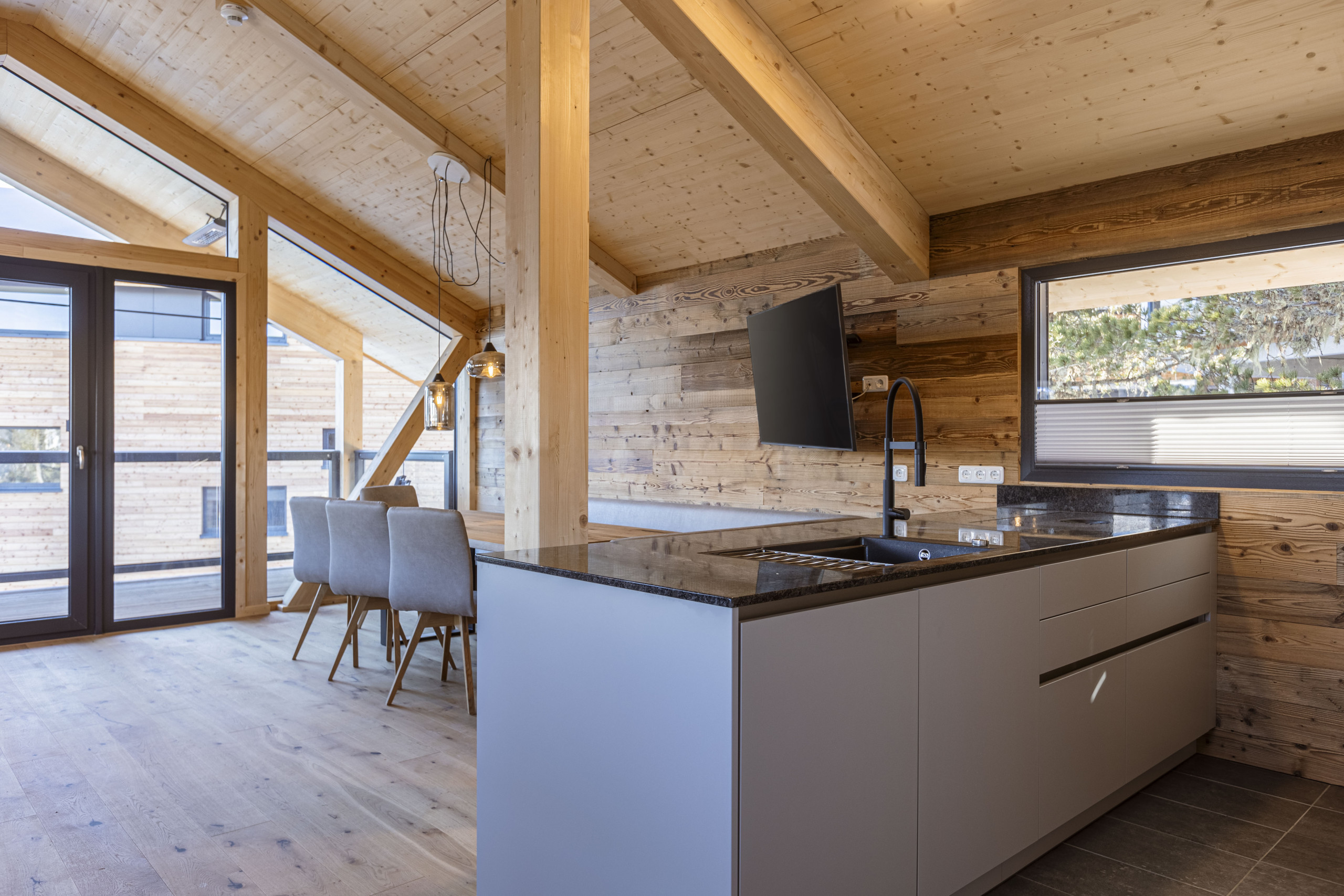 Experience pure relaxation in your private Finnish sauna or in the hot tub without whirlpool function on the terrace, while enjoying the breathtaking view of the surrounding mountain landscape. Some bedrooms even open onto balconies that look directly into the stone pine forest – a place where you can let your soul dangle.