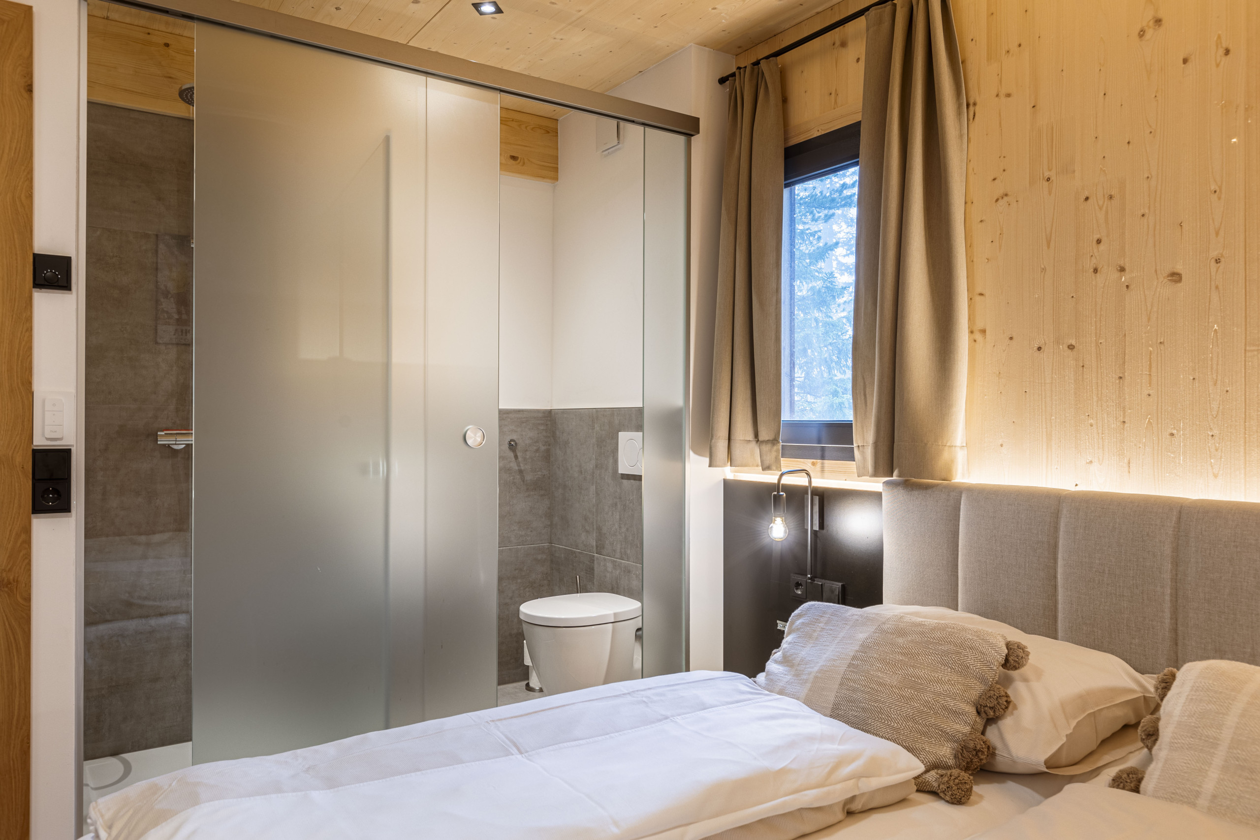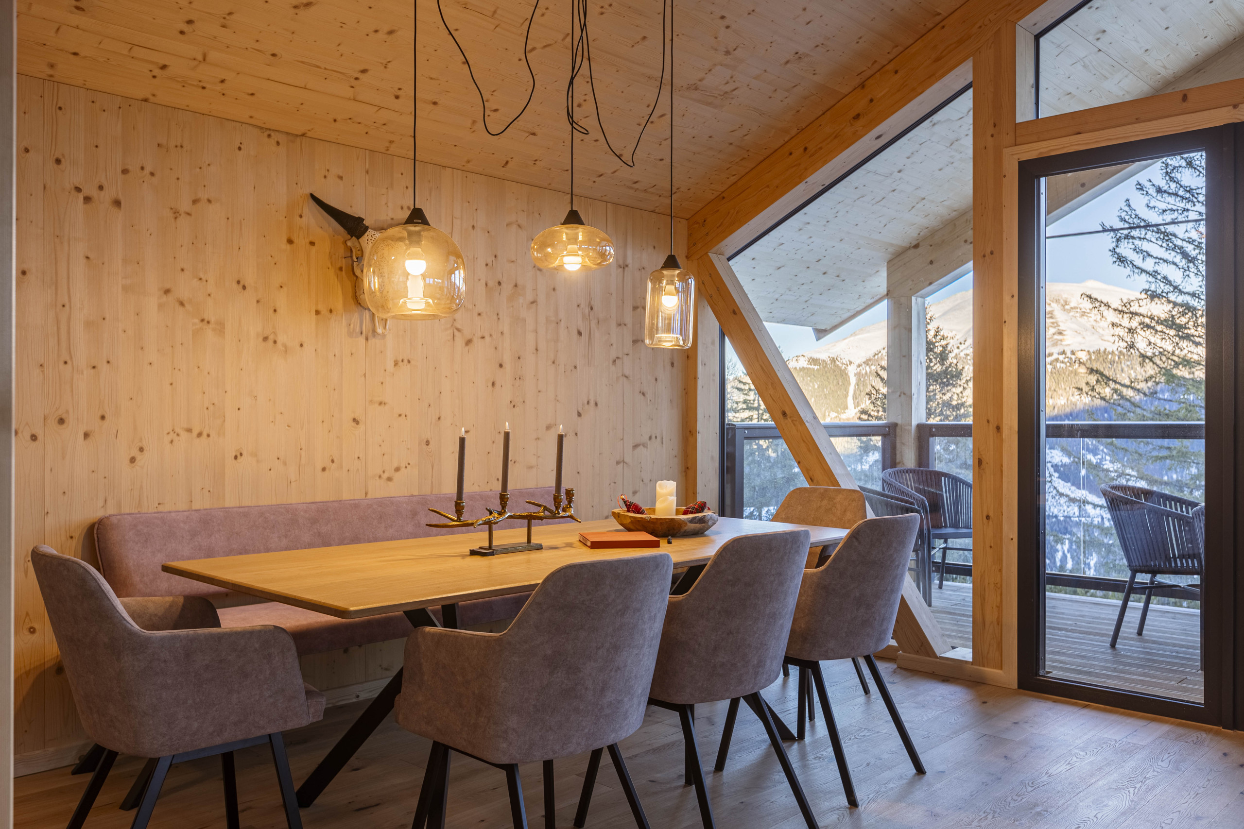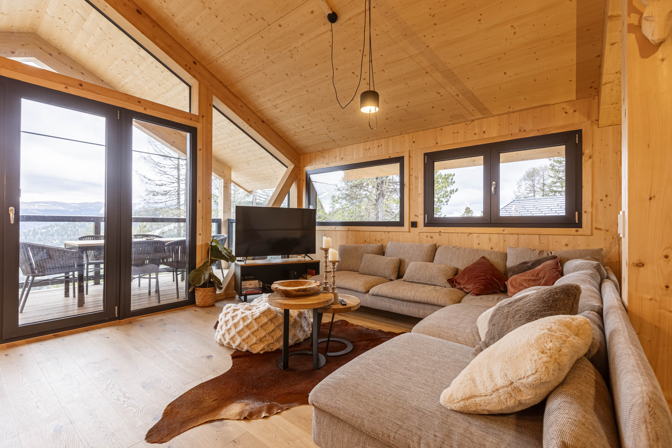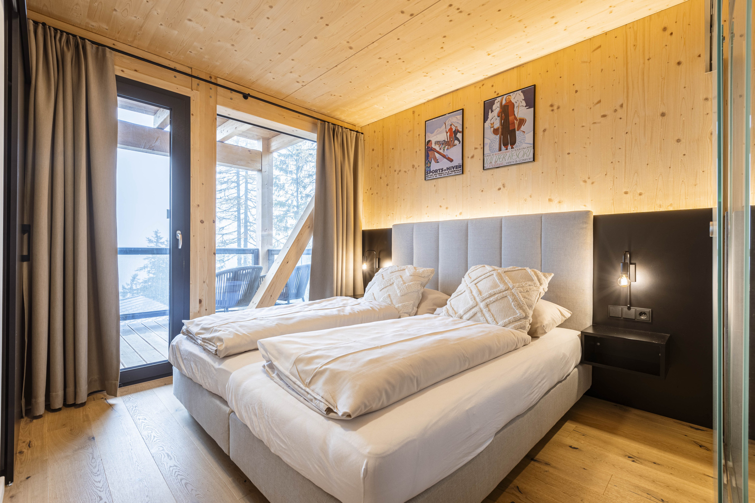Experience pure relaxation in your private Finnish sauna or in the hot tub without whirlpool function on the terrace, while enjoying the breathtaking view of the surrounding mountain landscape. Some bedrooms even open onto balconies that look directly into the stone pine forest – a place where you can let your soul dangle.