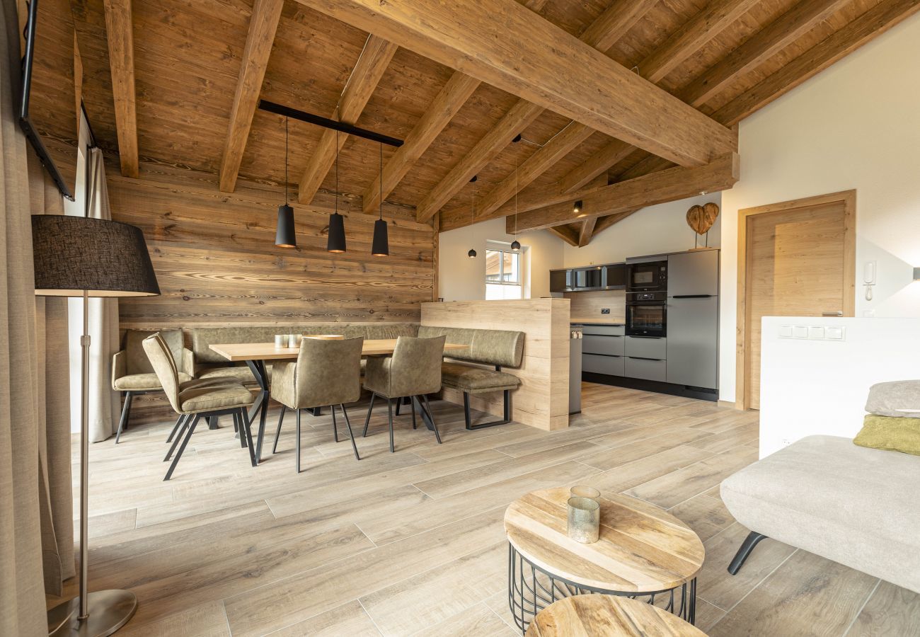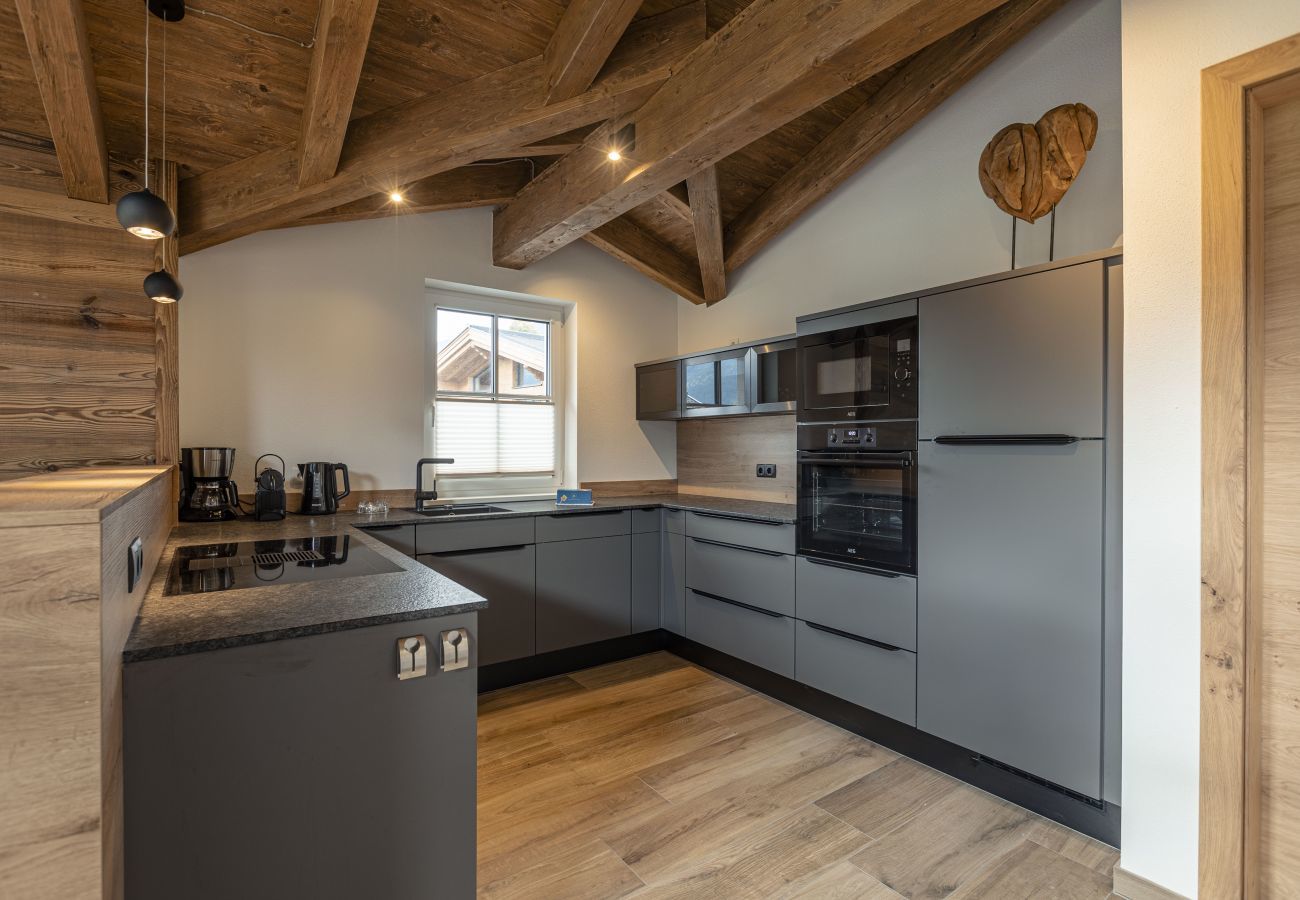 The living area and the open kitchen are located on the upper floor. It is fully equipped: Cutlery and (cooking) dishes are available, a ceramic cooktop, oven, dishwasher, and a refrigerator with freezer compartment are part of the equipment, as well as a toaster, electric kettle, and a coffee machine.