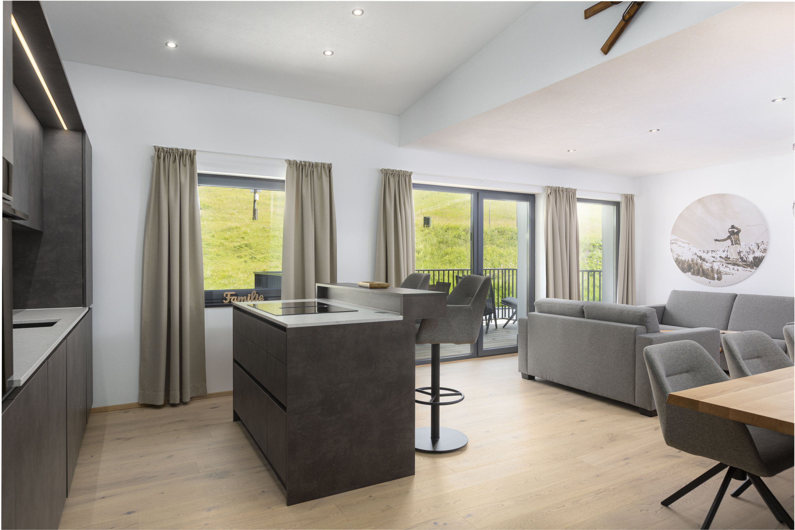 De volledig uitgeruste keuken nodigt uit om samen te koken en te genieten. Bestek en (kook)borden zijn aanwezig, fornuis, oven, magnetron, koelkast en vaatwasser behoren ook tot de uitrusting, evenals broodrooster, waterkoker en koffiezetapparaat. Een kleine ALPS RESORTS startset met vaatwastablet, afwasmiddel (20 ml), spons, vuilniszak, schoonmaak- en theedoek is beschikbaar bij aankomst.