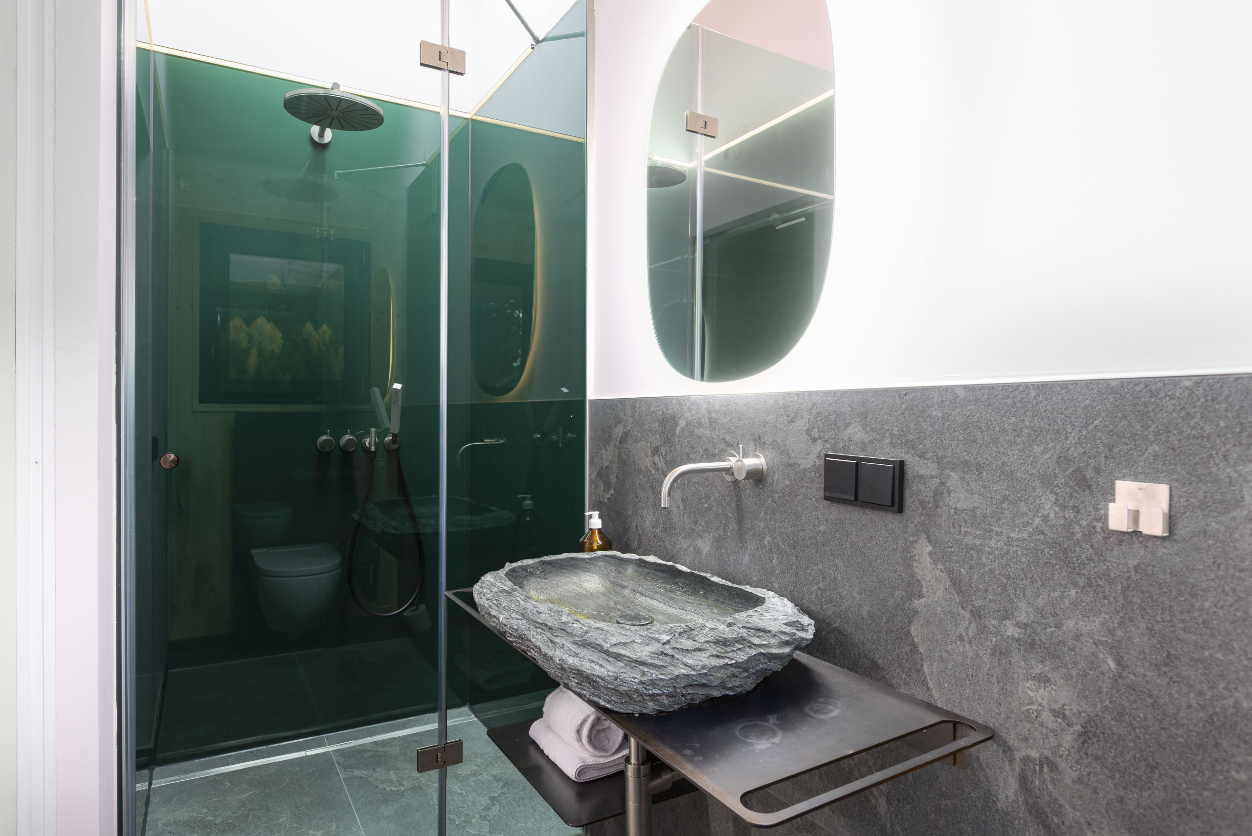 • Vier badkamers met MARAZZI-fijnsteen, natuurstenen wastafels, VOLA roestvrij staal & DYSON Airwrap