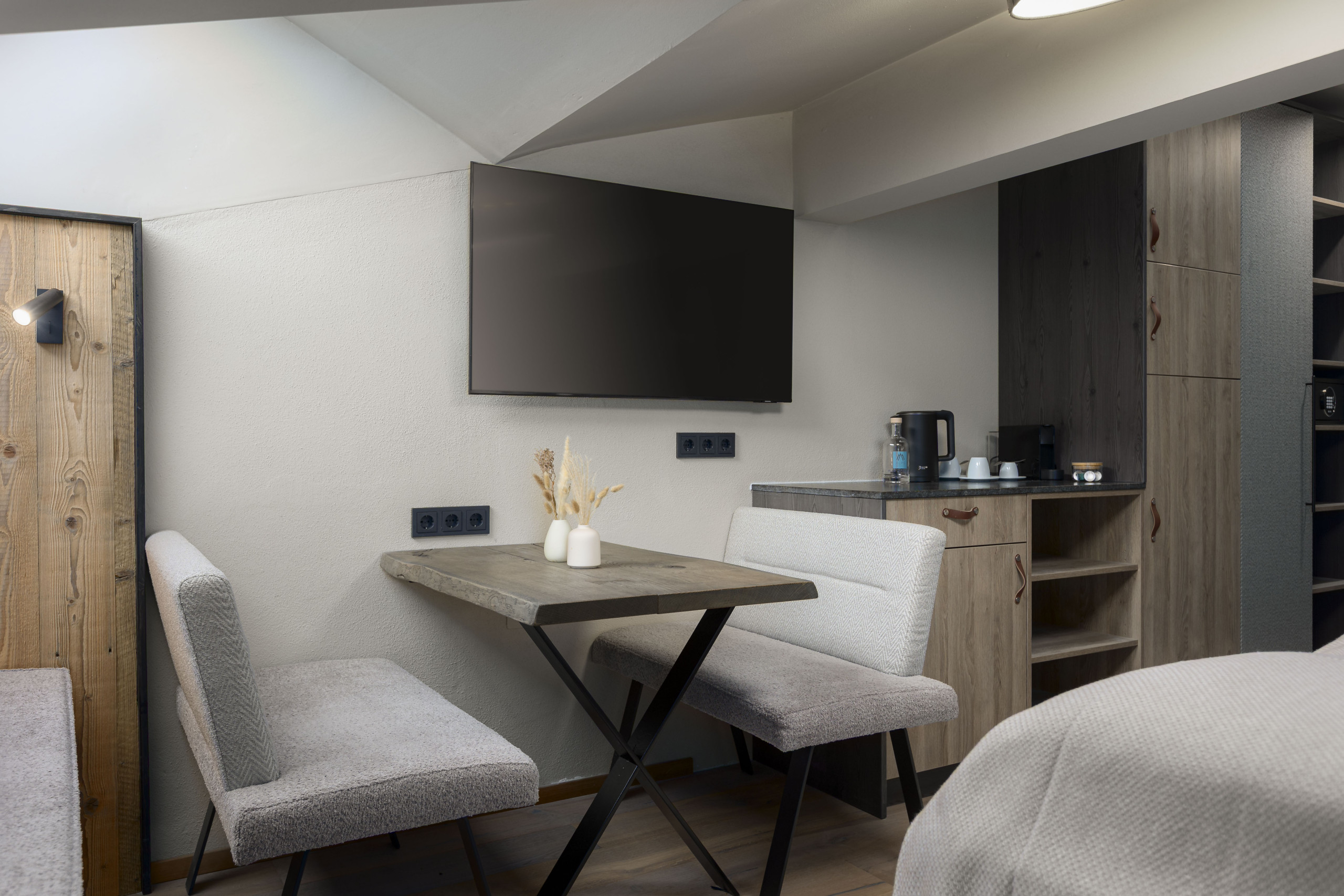 Zur Ausstattung gehören Wasserkocher, Nespresso-Maschine und Minibar.
