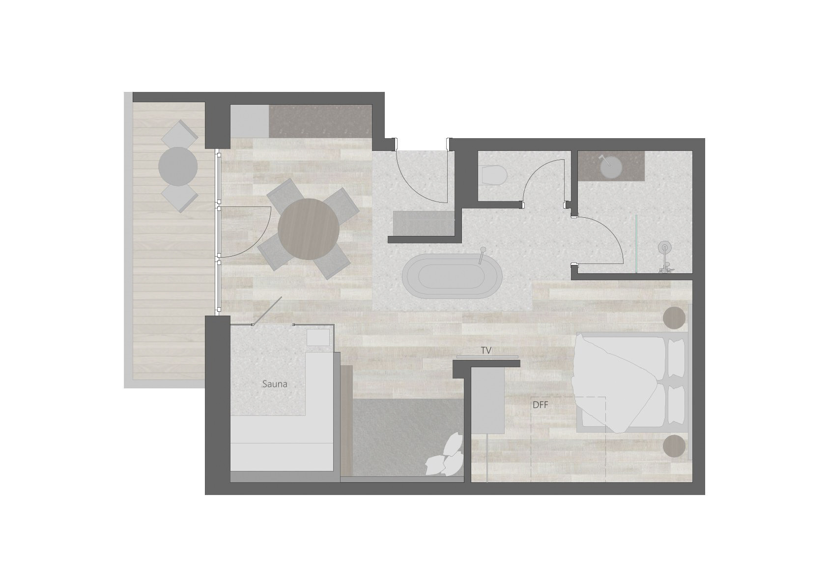 Die Junior Suite bietet auf 50 m² Platz für bis zu 4 Personen. Sie verfügt über ein Schlafzimmer mit Doppelbett. Ein Badezimmer mit Dusche und Badewanne sowie ein separates WC sind vorhanden. Im Wohnbereich bietet ein 140 cm breites Schlafsofa eine Schlafgelegenheit für bis zu 2 Kinder. Der Balkon lädt zum Entspannen ein. Die private Sauna ist das Highlight der Suite.