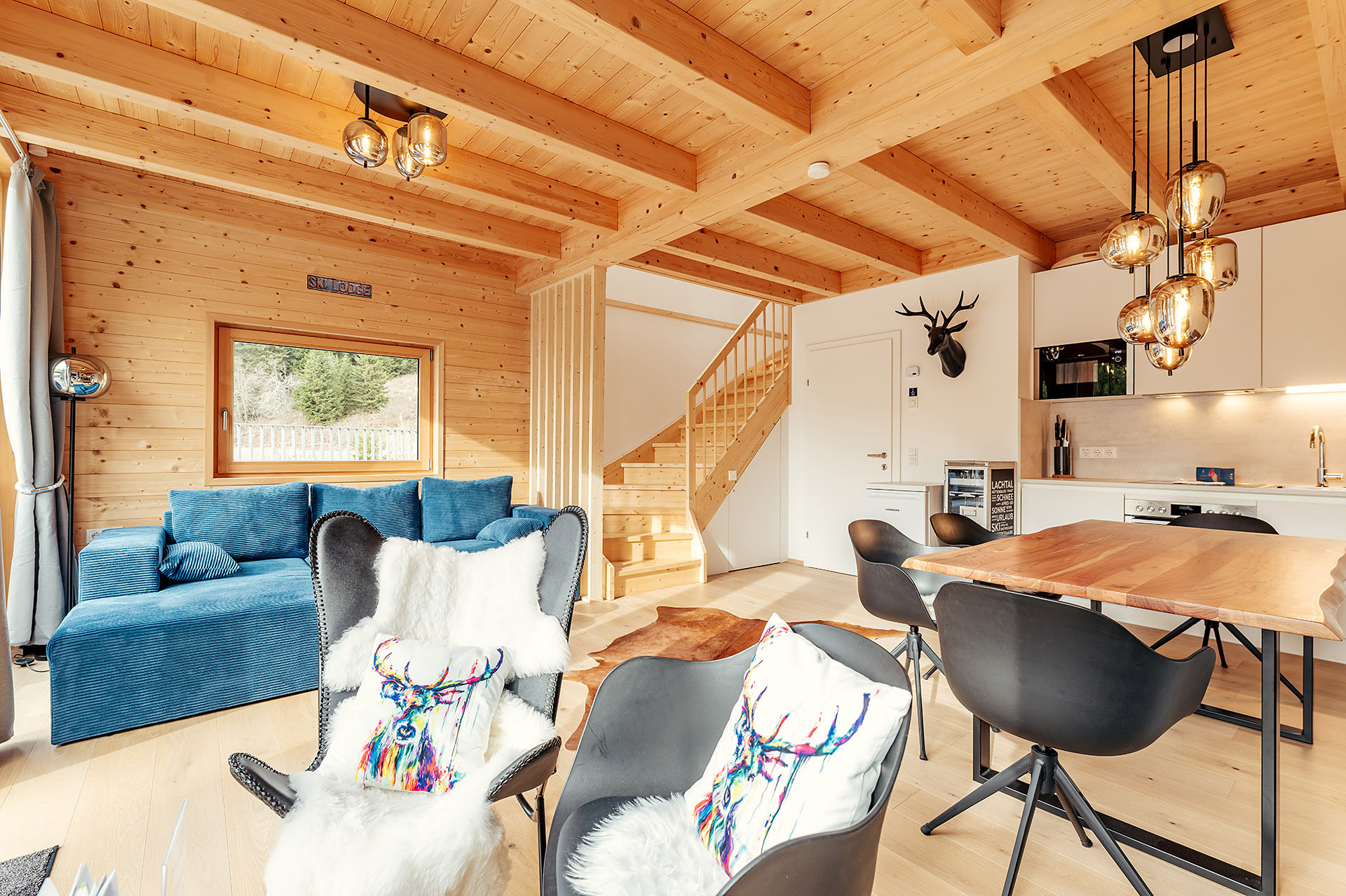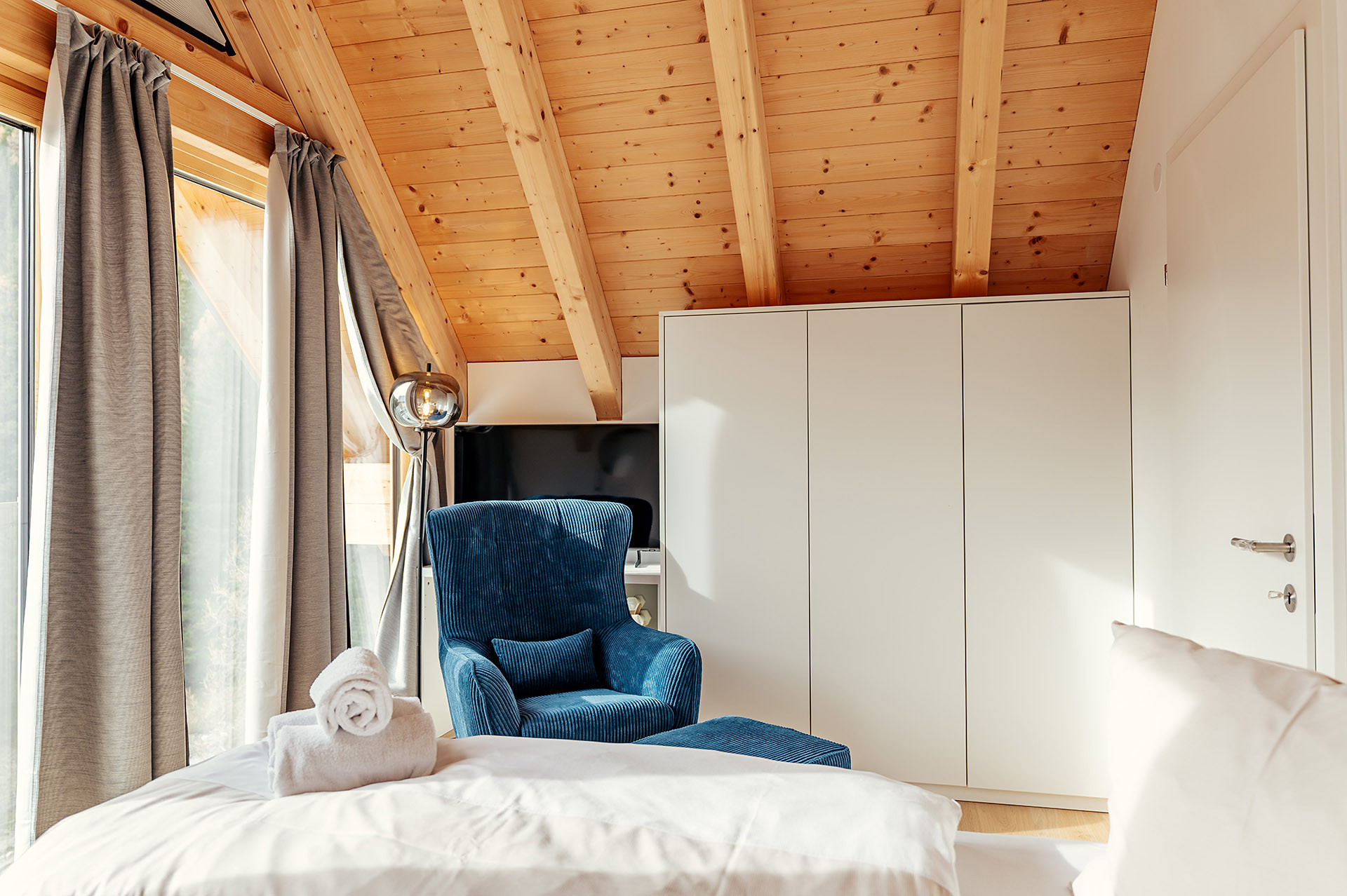 Das zweistöckige Chalet bietet auf einer Wohnfläche von 68 m² ausreichend Platz für bis zu 6 Personen. Es verfügt über 2 Schlafzimmer mit Doppelbetten. Im Wohnbereich stehen 2 weitere Schlafplätze zur Verfügung. Für maximalen Komfort bietet das Chalet zudem 2 Badezimmer mit Dusche sowie ein separates WC.