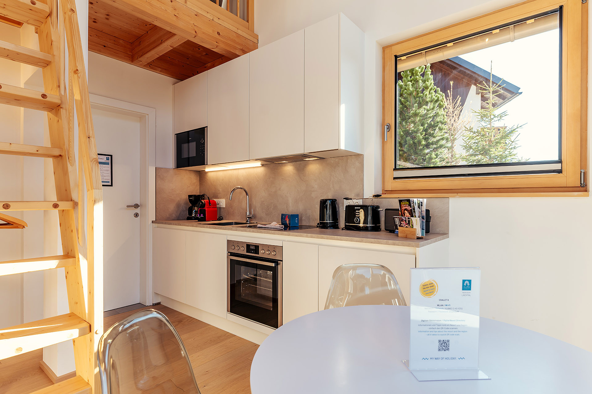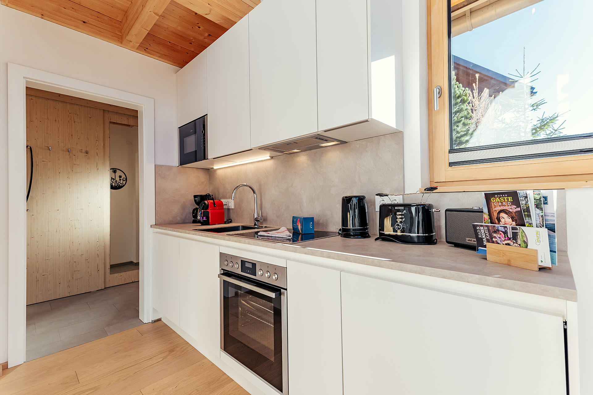 Die voll ausgestattete Küche lädt zum gemeinsamen Kochen und Genießen ein. Besteck und (Koch-) Geschirr ist vorhanden, Herd, Backofen, Mikrowelle, Kühlschrank und Geschirrspüler gehören ebenso zur Ausstattung wie Toaster, Wasserkocher und Nespresso Kaffeemaschine. Ein kleines ALPS RESORTS Starterset mit Geschirrspültab, Geschirrspülmittel (20 ml), Schwämmchen, Müllbeutel, Putz- und Geschirrtuch steht bei der Anreise bereit.