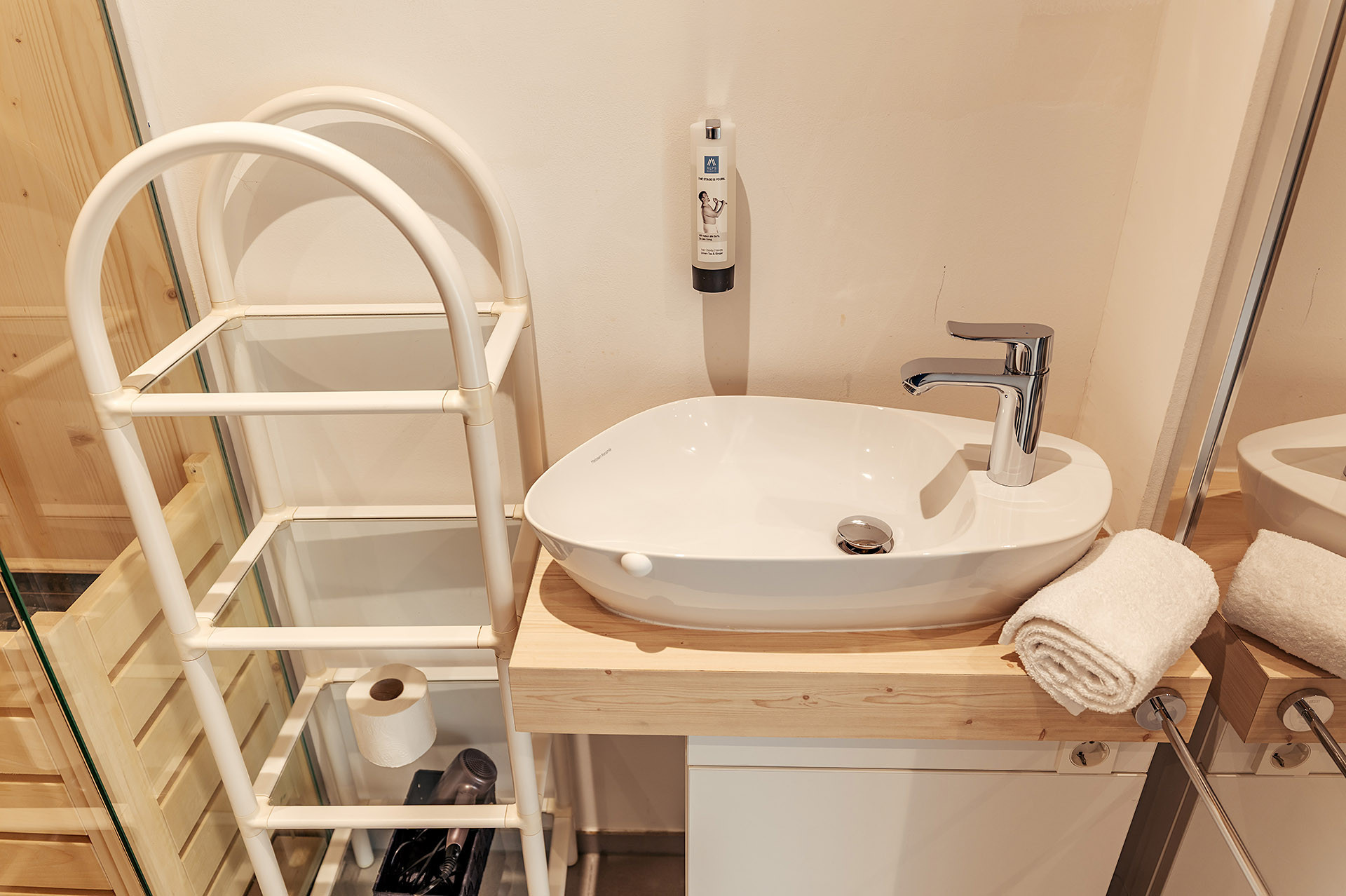 Das zweistöckige Chalet bietet auf 45 m² Platz für bis zu 2 Erwachsenen und 2 Kindern. Ausgestattet mit 1 Doppelschlafsofa im Erdgeschoss und 1 Einzelbett mit Ausziehlade im Dachgeschoss verfügt die Unterkunft über 1 Badezimmer mit Dusche und WC.