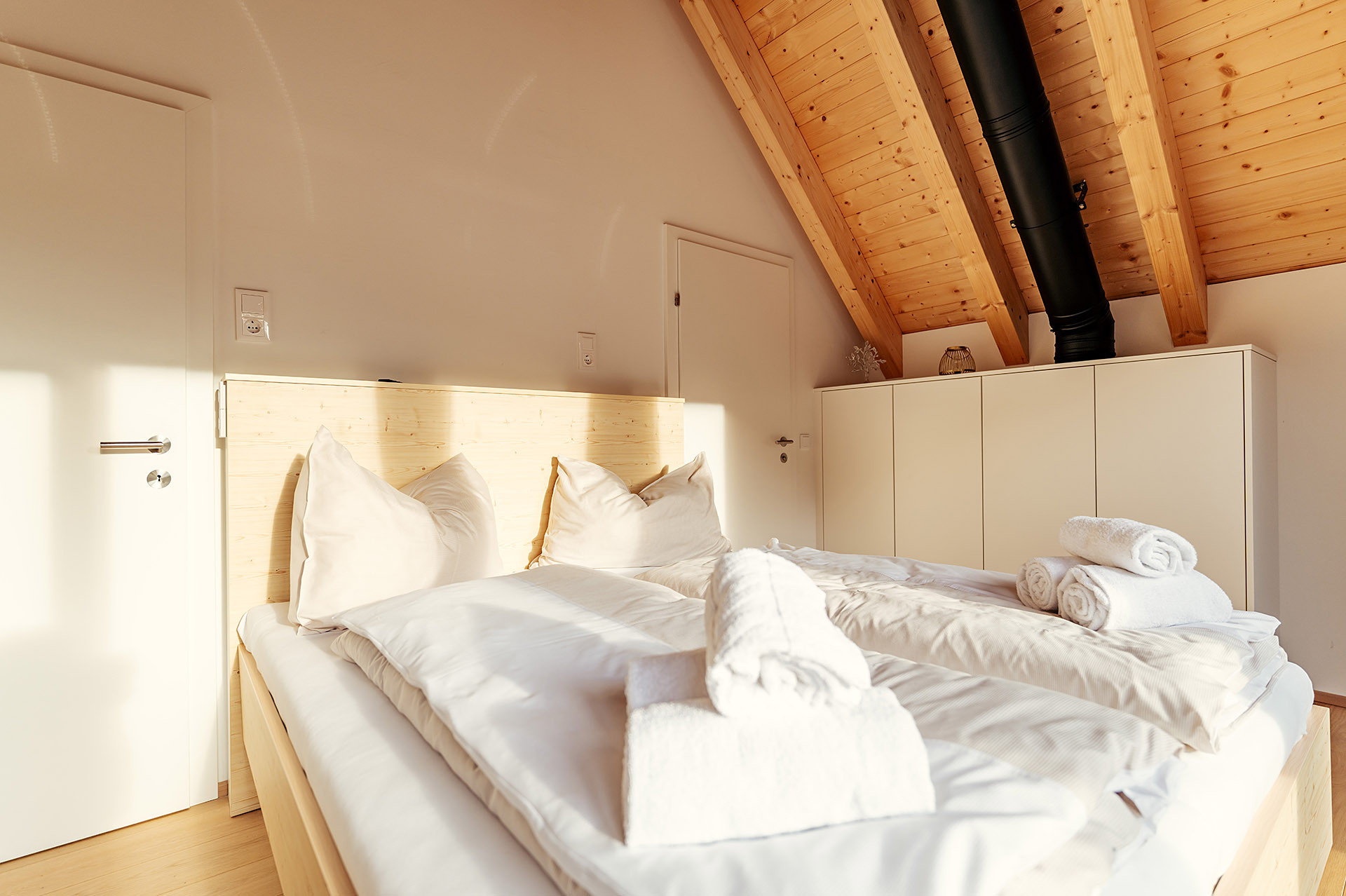 Das zweistöckige Chalet bietet auf einer Wohnfläche von 80 m² ausreichend Platz für bis zu 8 Personen. Es verfügt über 3 Schlafzimmer davon 2 mit Doppelbetten und 1 mit Stockbett, wobei eines der Schlafzimmer zusätzlich mit einer Badewanne ausgestattet ist. Im Wohnbereich stehen 2 weitere Schlafplätze zur Verfügung. Für maximalen Komfort bietet das Chalet zudem 2 Badezimmer mit Dusche sowie ein separates WC.