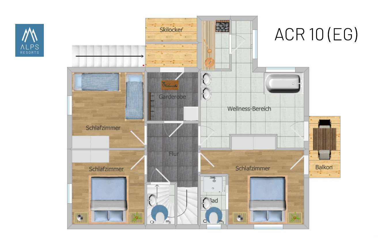 Auf stilvollen 120 m² Wohnfläche bietet dieses Superior Chalet Platz für bis zu 10 Personen. Das Superior Chalet verfügt über 4 Schlafzimmer, 4 Badezimmer mit Dusche und 1 Badezimmer mit Badewanne und finnischer Sauna. Sie schlafen in 3 Doppelbetten. Eines der Schlafzimmer verfügt über 2 Etagenbetten. Der Ausblick von den beiden Balkonen wird Sie ins Staunen bringen.