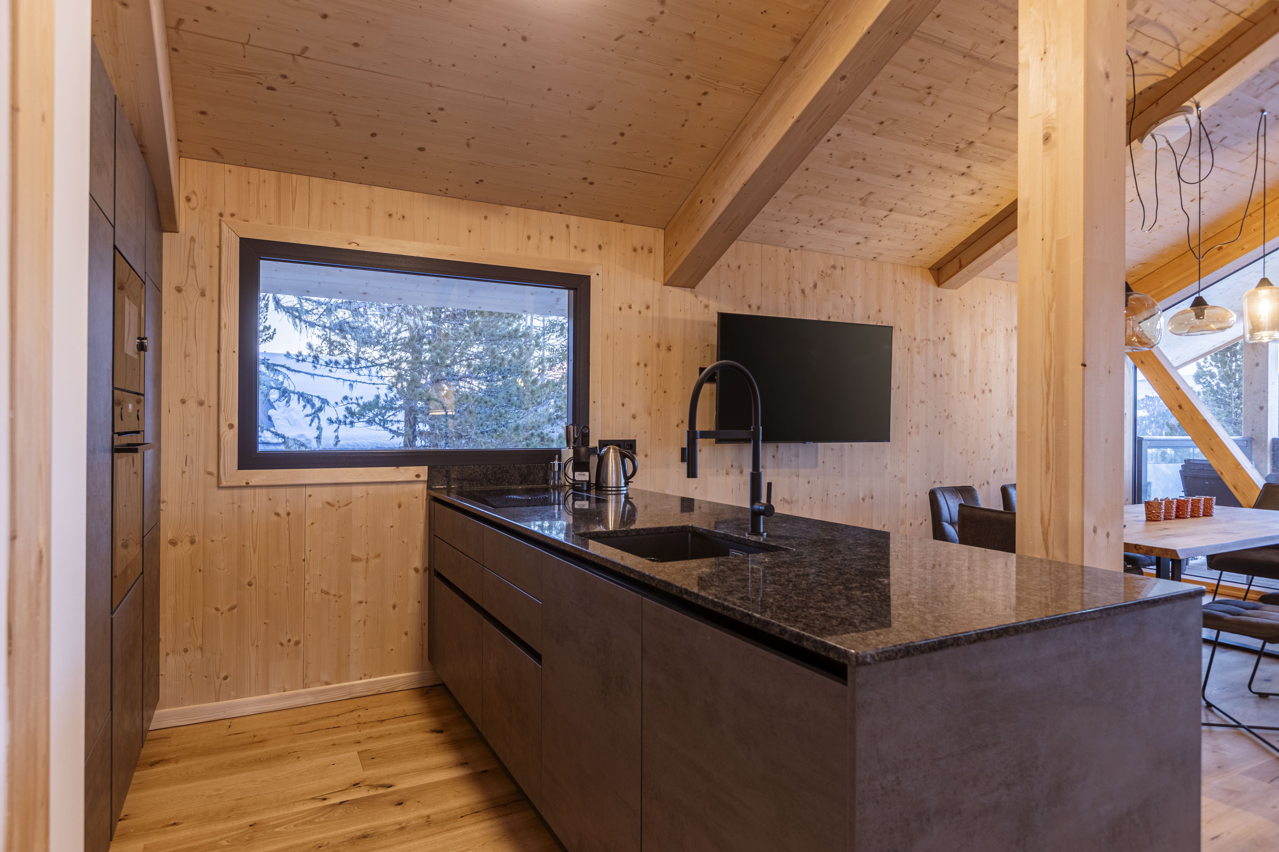 Erleben Sie pure Entspannung in Ihrer privaten finnischen Sauna oder im Hot Tub ohne Whirlfunktion auf der Terrasse, während Sie den atemberaubenden Blick auf die umliegende Bergwelt genießen. Einige Schlafzimmer öffnen sich sogar auf Balkone, die direkt in den Zirbenwald blicken – ein Ort, an dem Sie die Seele baumeln lassen können.