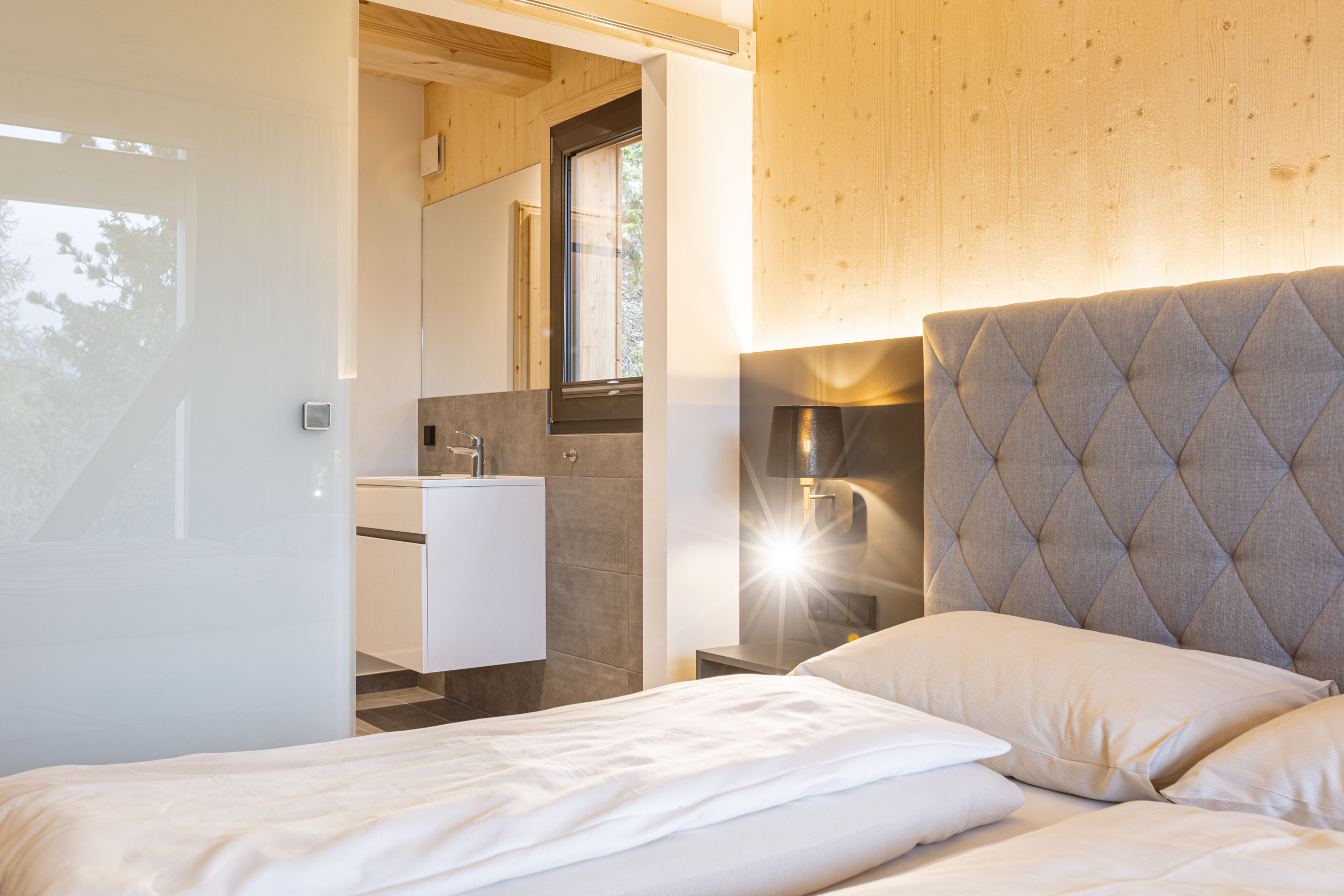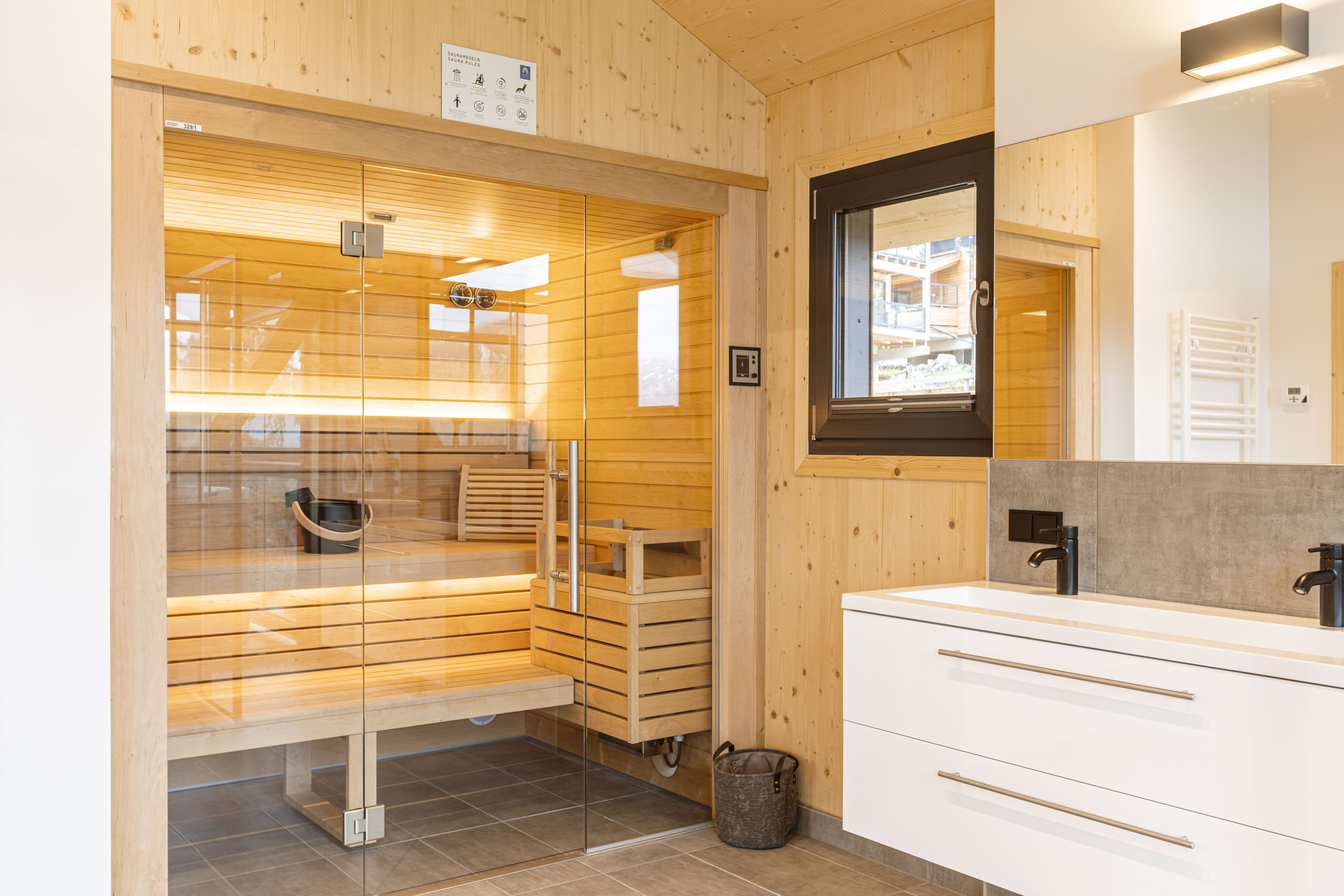 Erleben Sie pure Entspannung in Ihrer privaten finnischen Sauna oder im Hot Tub ohne Whirlfunktion auf der Terrasse, während Sie den atemberaubenden Blick auf die umliegende Bergwelt genießen. Einige Schlafzimmer öffnen sich sogar auf Balkone, die direkt in den Zirbenwald blicken – ein Ort, an dem Sie die Seele baumeln lassen können.