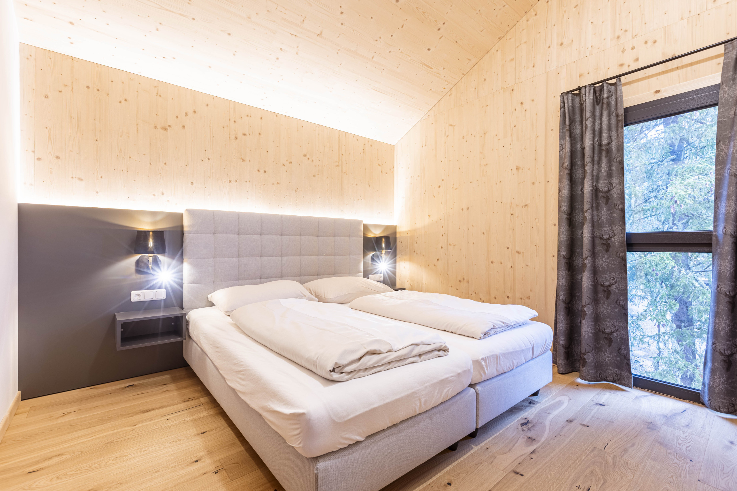 Erleben Sie pure Entspannung in Ihrer privaten finnischen Sauna oder im Hot Tub ohne Whirlfunktion auf der Terrasse, während Sie den atemberaubenden Blick auf die umliegende Bergwelt genießen. Einige Schlafzimmer öffnen sich sogar auf Balkone, die direkt in den Zirbenwald blicken – ein Ort, an dem Sie die Seele baumeln lassen können.